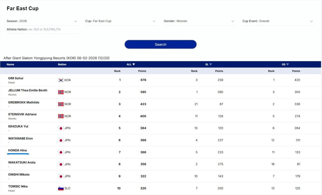 本田陽菜選手は1月29日~30日・2月5日~6日のGSはそれぞれ14位・10位・10位・8位、2月2日~3日のSLはDNF・9位、でした。帰国後に国スポそして日本でのFEC連戦が続きます。本田陽菜選手がんばれー!(現時点のStandingは下記の通り)